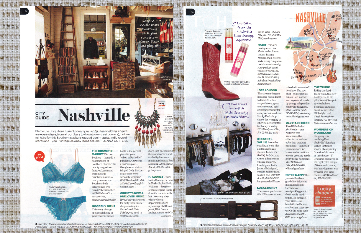 Nothing delights me more than flipping through a magazine and seeing my city featured. For those that don’t know, Nashville is so much more than cowboy boots and hats. The guide can be found in the August 2012 issue of Lucky Magazine