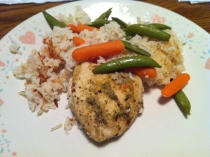 Marinade chicken (with rub) for one hour in the refrigerator Preheat oven to 375. Spray baking dish with cooking spray. Add rice and water to baking dish and stir (add salt and pepper, to taste – I did not add any, the chicken provided a nice flavor for the rice). Add chicken and sugar snap peas and carrots. Bake covered for 45 minutes.